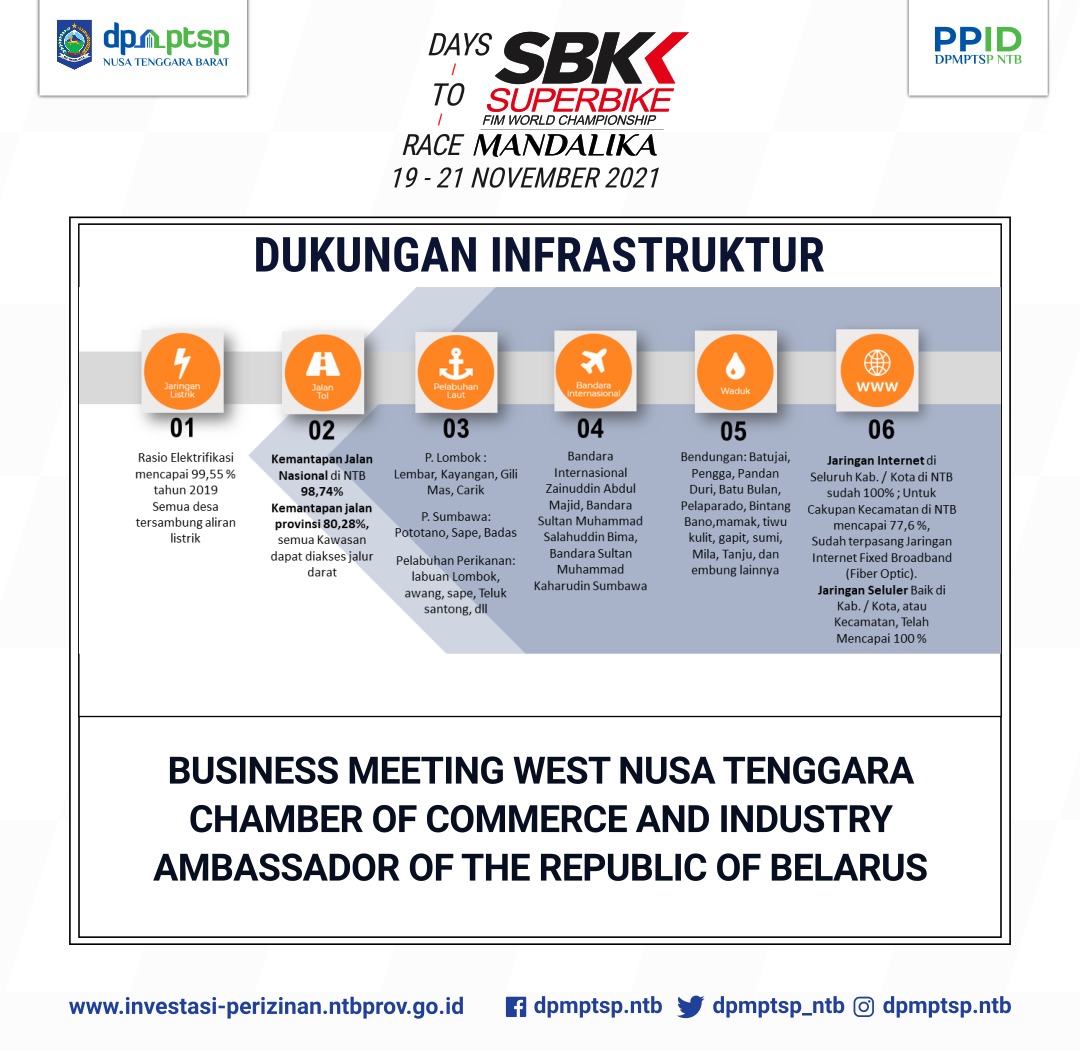 Provinsi NTB saat ini juga sedang disorot seluruh dunia karena perhelatan World Superbike di Sirkuit Mandalika. Hal ini menjadi salah satu daya tarik tersendiri untuk pengembangan investasi di Provinsi NTB. Mandalika akan menjadi magnet dan epicenter investasi – investasi lainnya. Selain itu, Pemerintah Provinsi NTB terus tengah menjalankan program industrialisasi untuk mendongkrak kondisi perekonomian dan kemandirian masyarakat. Diharapkan melalui kunjungan ini rombongan dapat memperoleh informasi yang komprehensif dan dapat menyusun rencana untuk berinvestasi di Provinsi NTB.