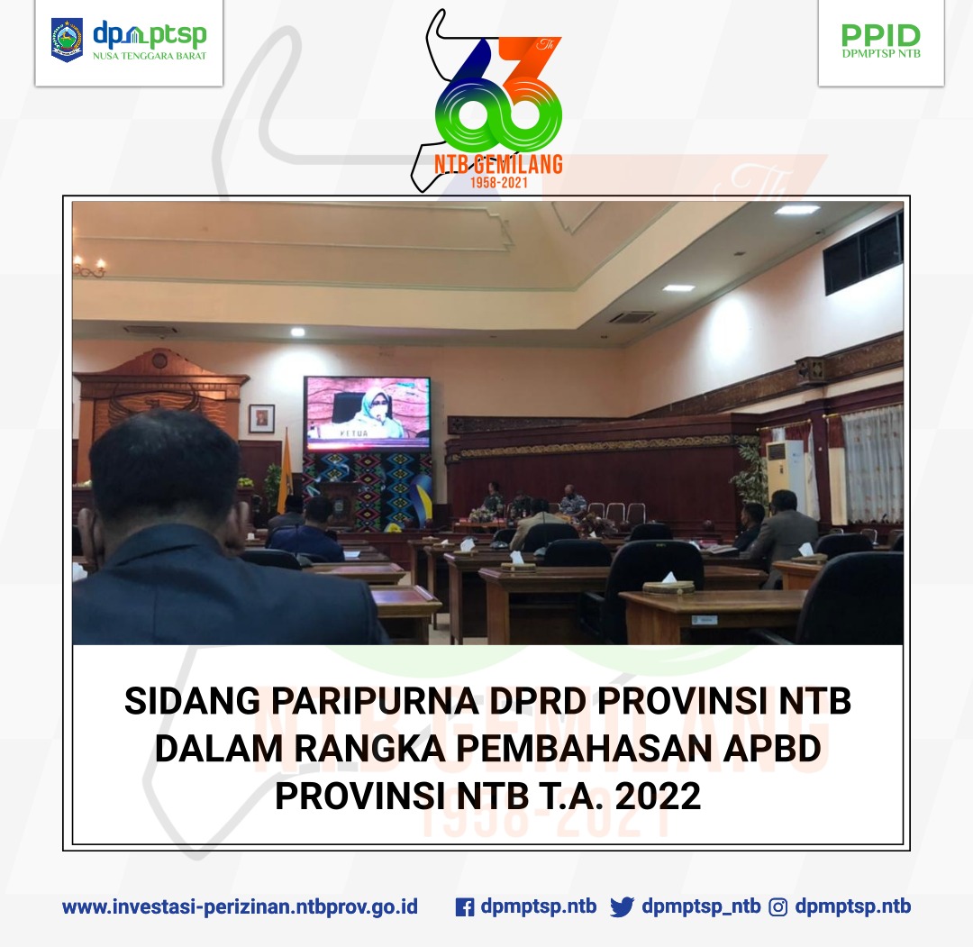 DPMPTSP Provinsi NTB mengikuti Sidang Paripurna Masa Persidangan III Tahun Sidang 2021, Pada hari Kamis malam (25 November 2021). Menghadiri kegiatan tersebut, Wakil Gubernur NTB Dr. Ir. Hj. Sitti Rohmi Djalilah M.Pd menyampaikan rasa syukur atas telah ditandatanganinya KUA PPAS Provinsi NTB Tahun Anggaran 2022 beberapa waktu yang lalu. KUA PPAS tersebut akan menjadi acuan rencana penyelenggaraan program pembangunan NTB di tahun 2022 mendatang.
