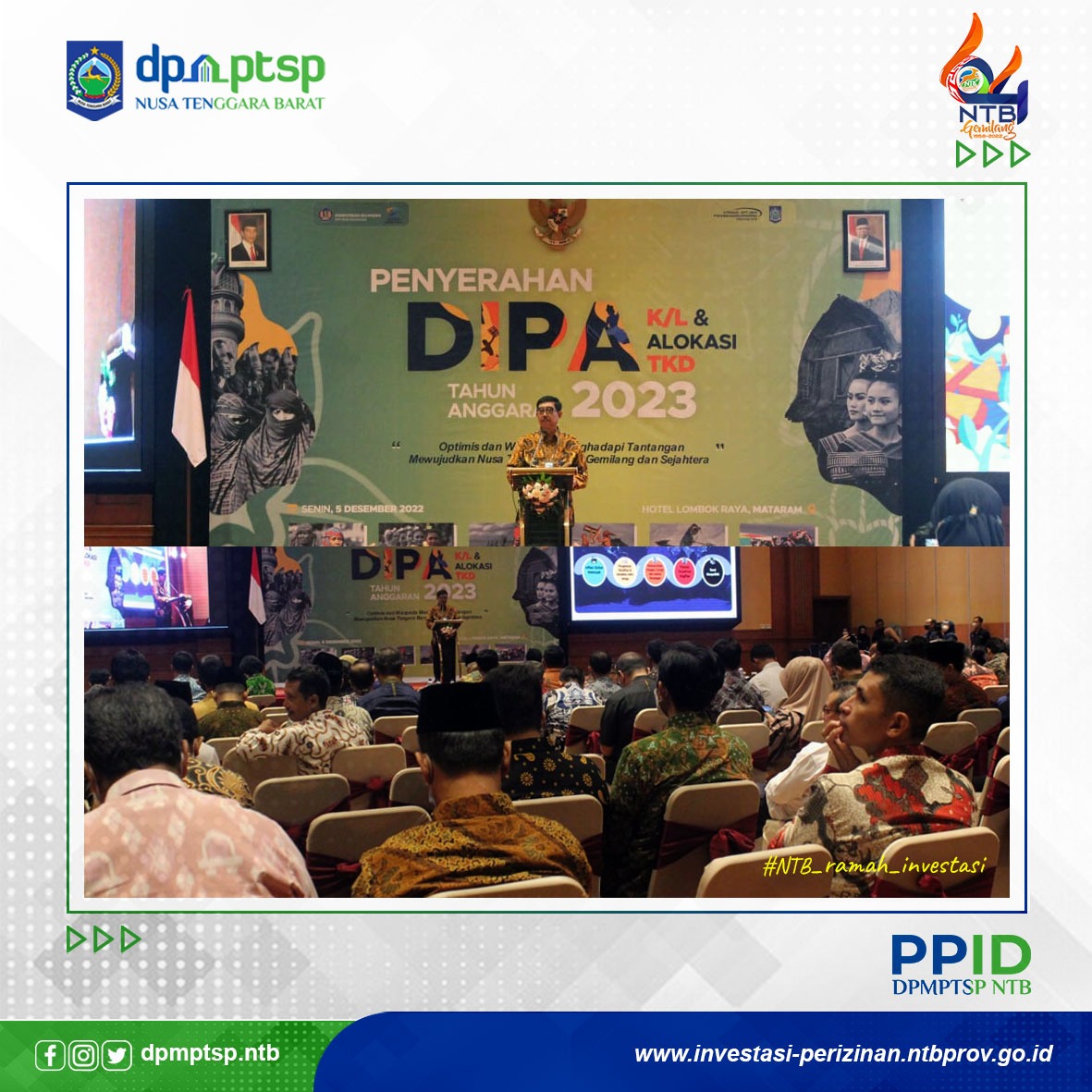 Sekretaris DPMPTSP Provinsi NTB, Wahyu Hidayat, S.STP., MAP, menghadiri acara penyerahan DIPA K/L dan Alokasi TKD Tahun Anggaran 2023 di Hotel Lombok Raya (5/12). Acara yang di inisiasi oleh Ditjen Perbendaharaan Provinsi NTB ini mengusung tema “Optimis dan Waspada Menghadapi Tantangan Mewujudkan NTB Gemilang dan Sejahtera.