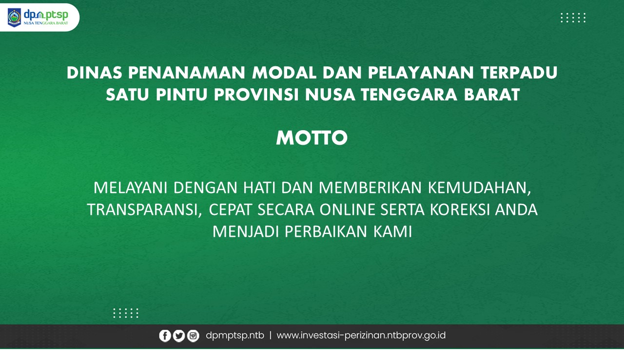 Sesuai ketentuan Undang-Undang Nomor 23 Tahun 2014 tentang Pemerintah Daerah sebagaimana telah beberapa kali diubah terakhir dengan Undang-Undang Nomor 9 Tahun 2015 tentang perubahan kedua atas Undang-Undang Nomor 23 Tahun 2014 tentang Pemerintahan Daerah serta Undang–Undang Nomor 25 Tahun 2007 tentang Penanaman Modal dengan tujuan mendorong terciptanya iklim investasi yang kondusif bagi penanaman modal untuk penguatan daya saing perekonomian daerah di wilayah Provinsi NTB, serta berfungsi sebagai lembaga yang membantu Gubernur/ Kepala Daerah dalam menjalankan urusan pemerintahan di bidang penanaman modal.